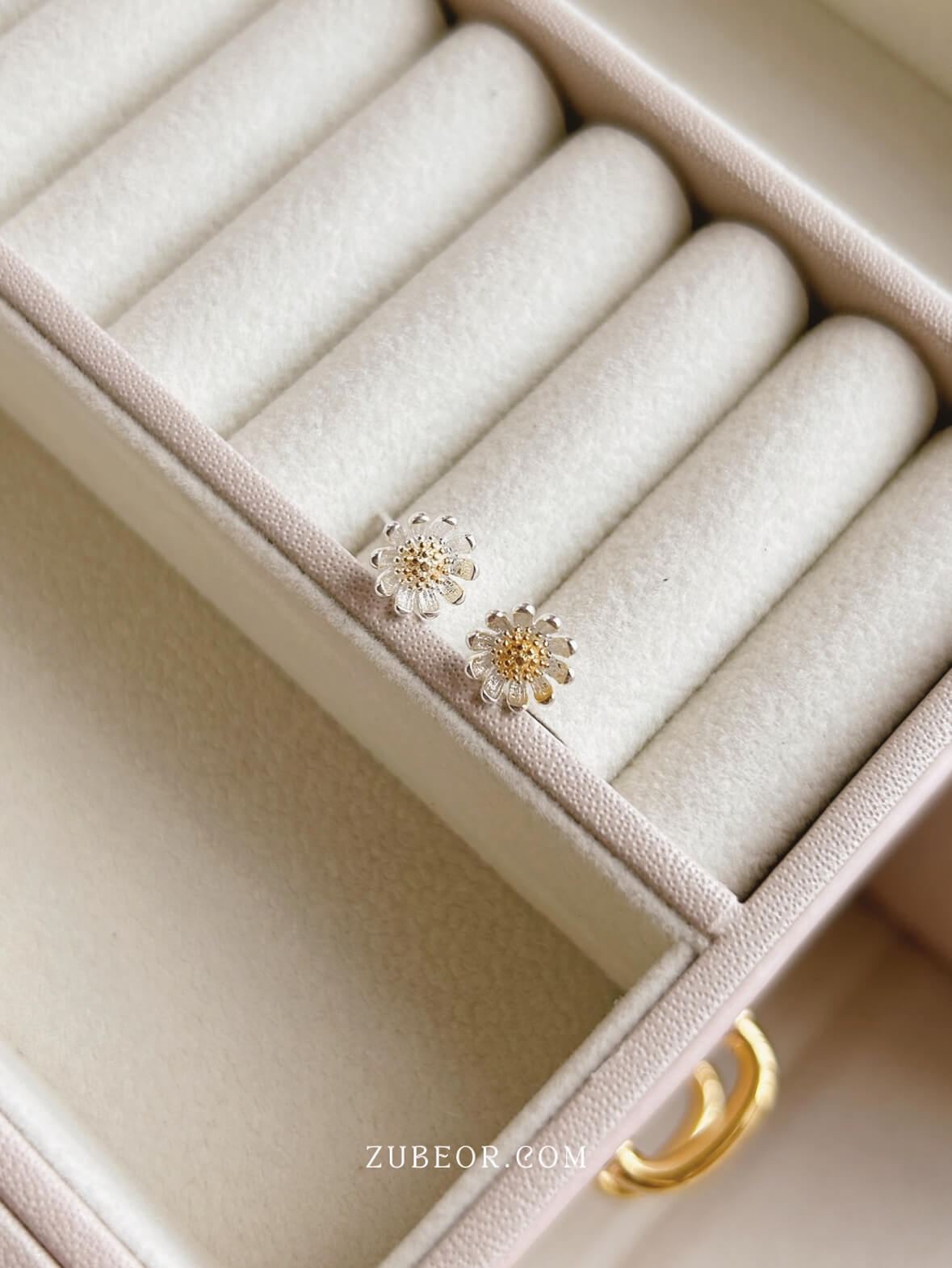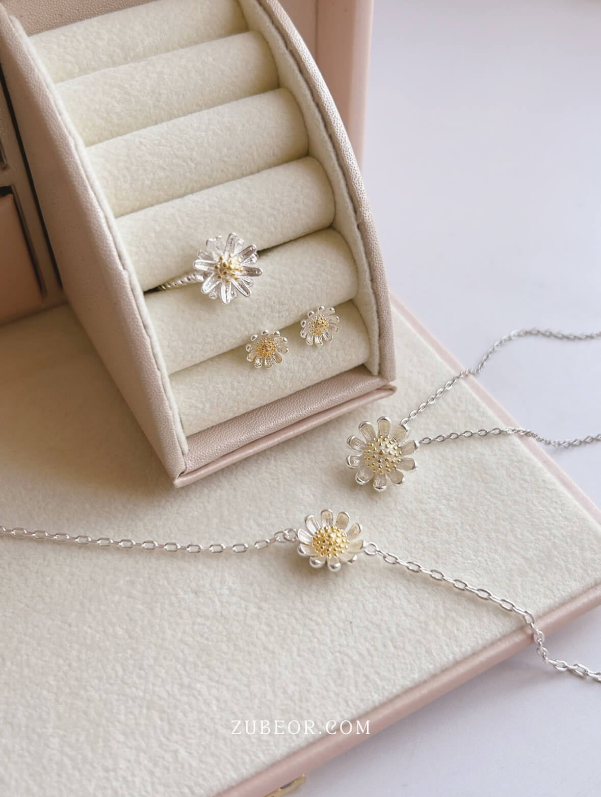 Set de completo de 4 piezas margarita: Aretes, anillo, pulsera y cadena.